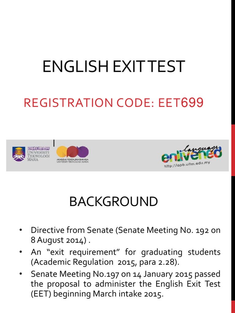 Eet699 Slides For Students Pptx English Exit Test Registration Code Eet699 Background U2022 U2022 U2022 Directive From Senate Senate Meeting No 192 On 8 Course Hero