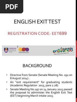 English exit test uitm. Faculty of accountancy level 14 menara saas universiti teknologi mara 40450 shah alam selangor 603 55444802 professional programmes. English exit test eet ogos 2020. Apa itu english exist test eet699 perlaksanaan eet669 student uitm semester akhir eet669 iras test muet description of levels for uitm eet guideline for speaking eet699. Tujuan dia adalah sebagai syarat untuk grad nanti.