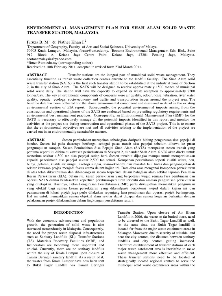 Environmental Management Plan For Shah Alam Solid Waste Environmental Monitoring Environmental Impact Assessment