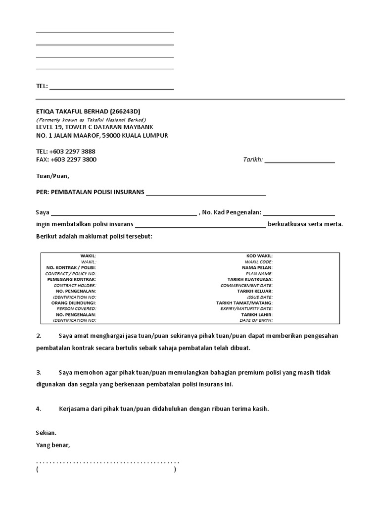 Etiqa Contoh Surat Pembatalan Polisi Insurans