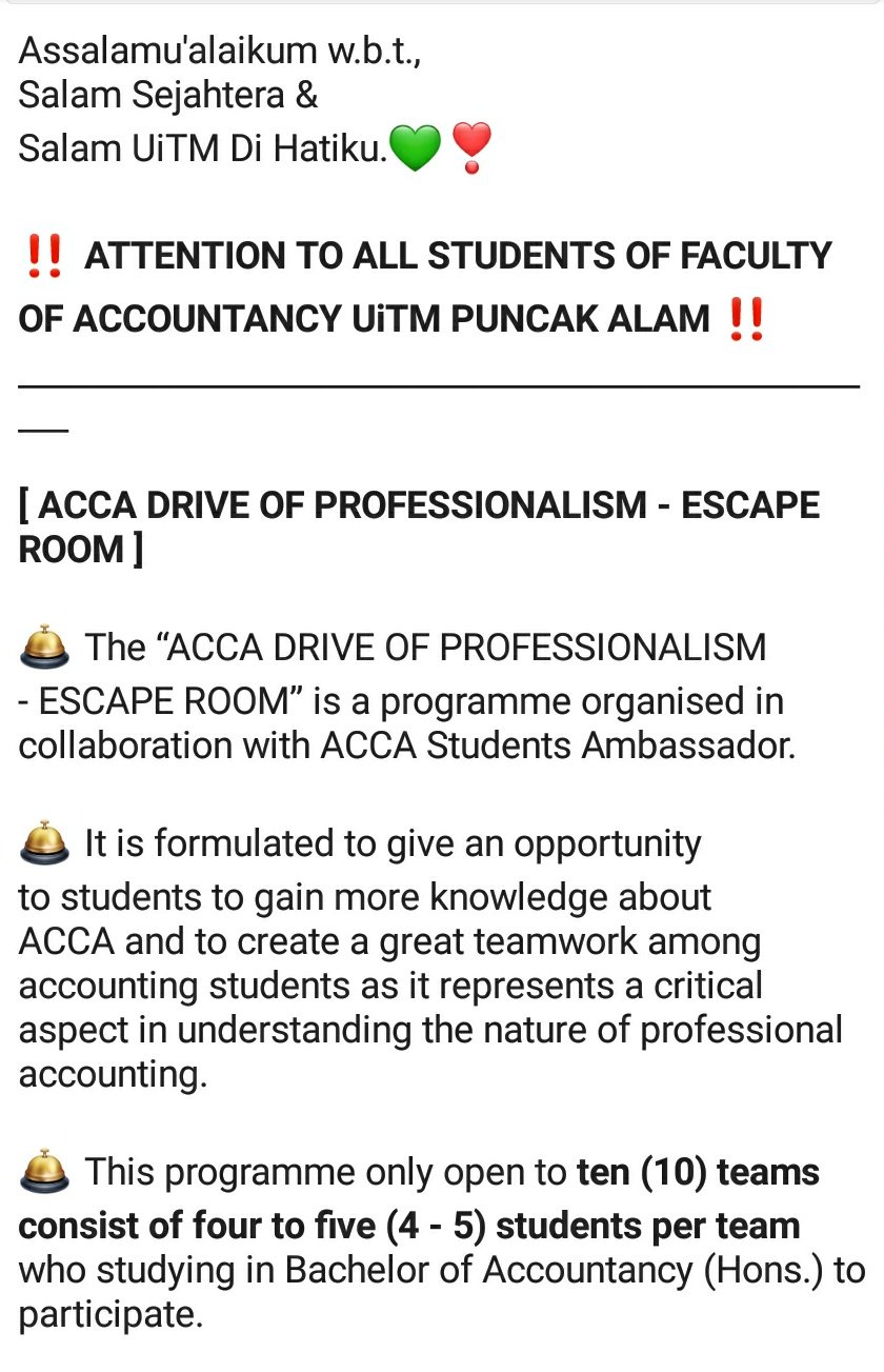 Smf Perakaunan On Twitter Assalamualaikum W B T Attention To All Students Of Faculty Of Accountancy Uitm Puncak Alam Acca Drive Of Professionalism Escape Room Below Are More Details Link To Register