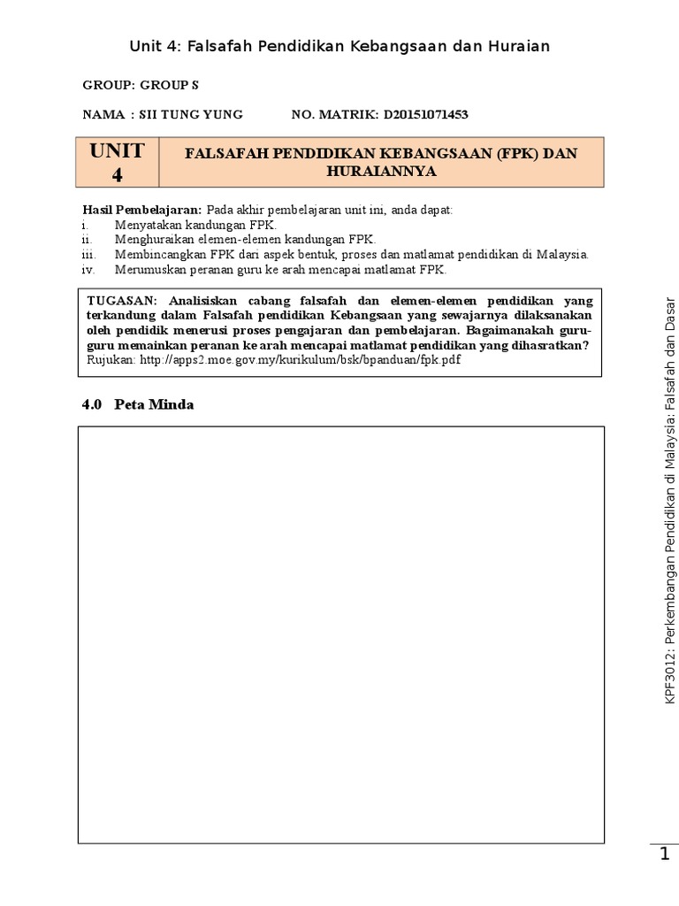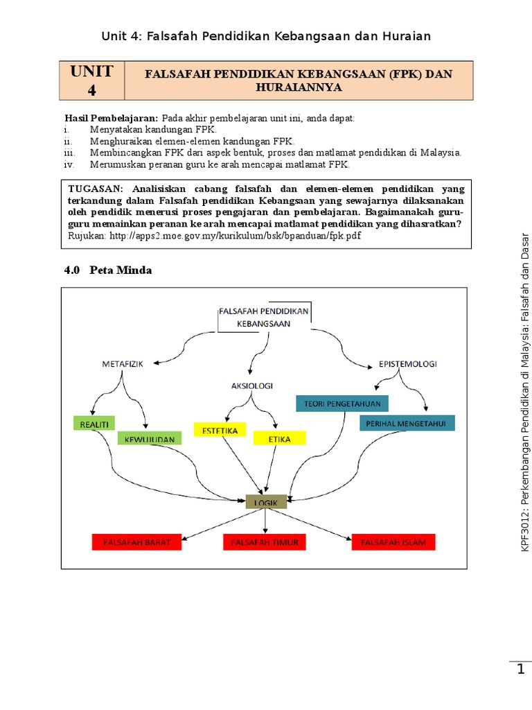 Falsafah pendidikan kebangsaan dan huraian. Huraian dan penghayatan hasil pembelajaran. Terdapat sepuluh kandungan falsafah pendidkan kebangsaan antaranya ialah. Pendidikan ialah satu proses dalam diri seseorang yang bermula sejak dari kandungan ibu lagi sehingga lah ke akhir hayat nya pendidikan yang diterima oleh seseorang berlaku dimana mana dan bukan nya hanya berlaku disekolah pendidikan ini berlaku secara berterusan secara formal. Cabang falsafah pendidikan kebangsaan fpk.
