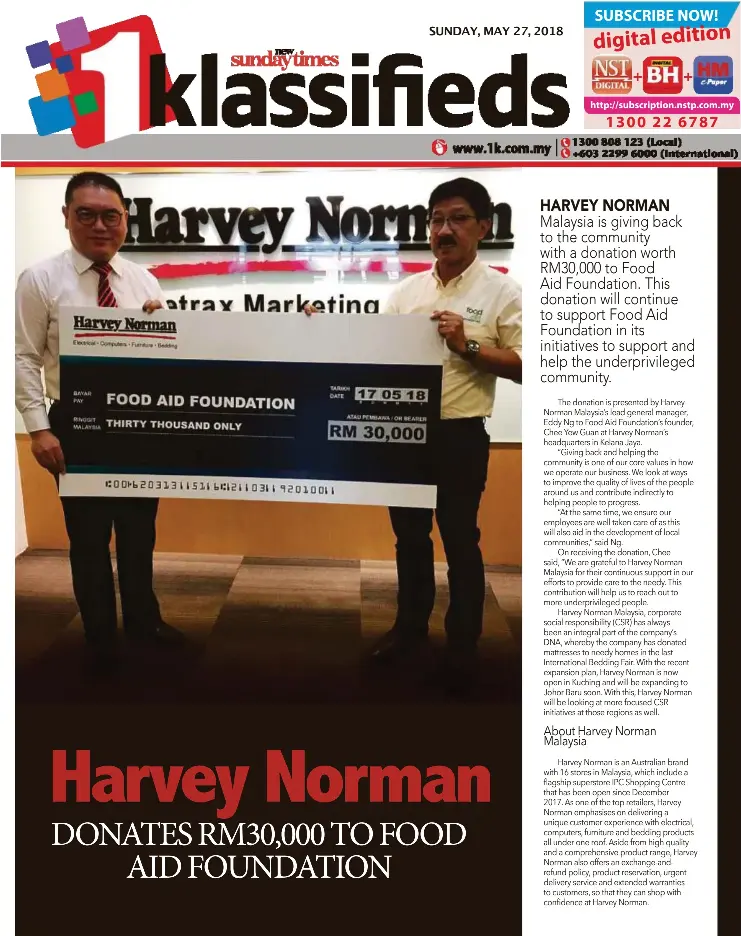 Pressreader New Straits Times 2018 05 27 Harvey Norman Donates Rm30 000 To Food Aid Foundation