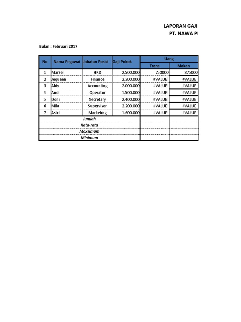 Laporan Gaji Pegawai Pt Nawa Perkasa Bulan Februari 2017 Uang Trans Makan