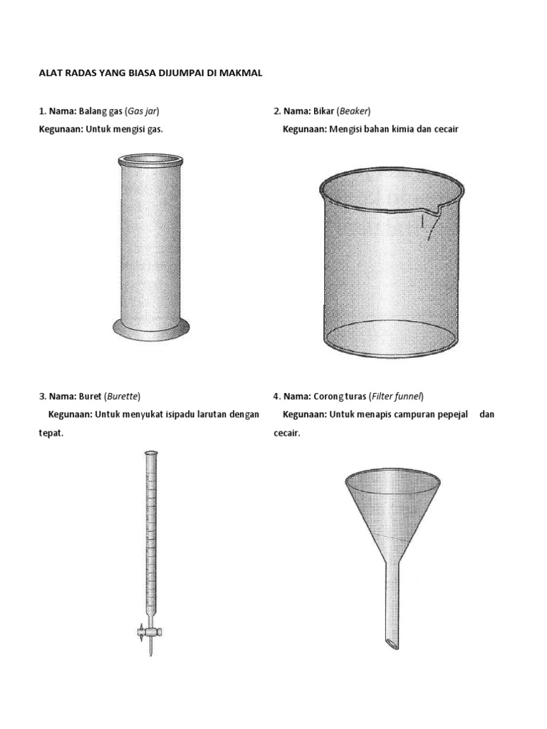 Untuk memanaskan bahan kimia. Rajah di bawah menunjukkan beberapa jenis alat radas yang biasa digunakan. Rajah di bawah menunjukkan beberapa jenis alat radas yang biasa digunakan. Terdapat pelbagai jenis alat radas di dalam makmal sains.