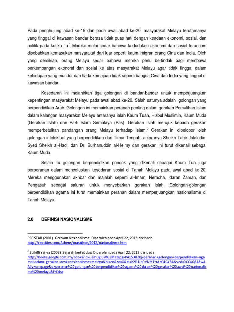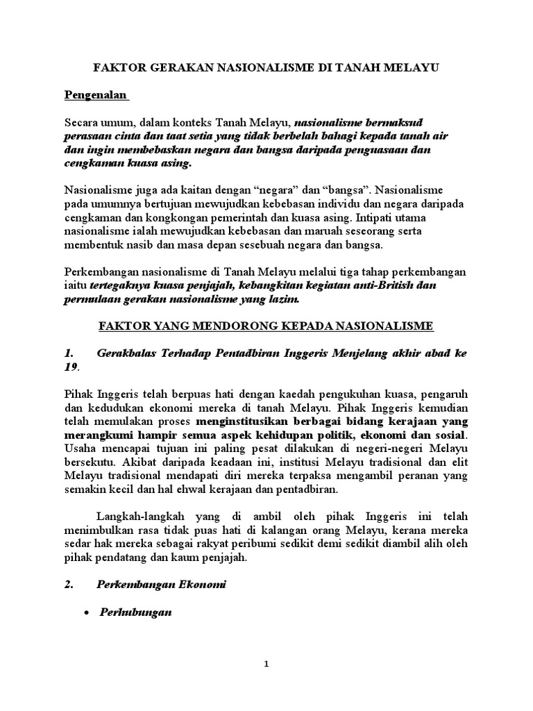 Gerakan nasionalisme di tanah melayu pdf. Di tanah melayu pengaruh gerakan turki muda ini tersebar dalam bidang politik pada tahun 1930. Seorang bekas pesuruhjaya tinggi british hugh clifford mendesak semua orang di negara ini menyedari hakikat bahawa ini adalah negara melayu dan kami datang ke britain atas jemputan tertinggi mereka raja raja melayu dan adalah tugas kami untuk membantu orang melayu memerintah. Suboradinasi politik dan ekonomi tanah jajahan oleh pemerintah kolonial menyebabkan rakyat berpendirian hanya kemerdekaan sahajalah satu cara untuk. Perkembangan gagasan nasionalisme melayu raya.
