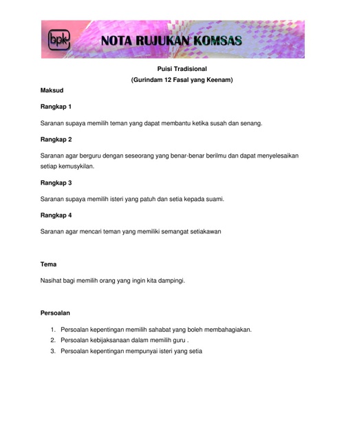 Ringkasan Puisi Tradisional Tingkatan 4 Berdasarkan Antologi Harga Remaja