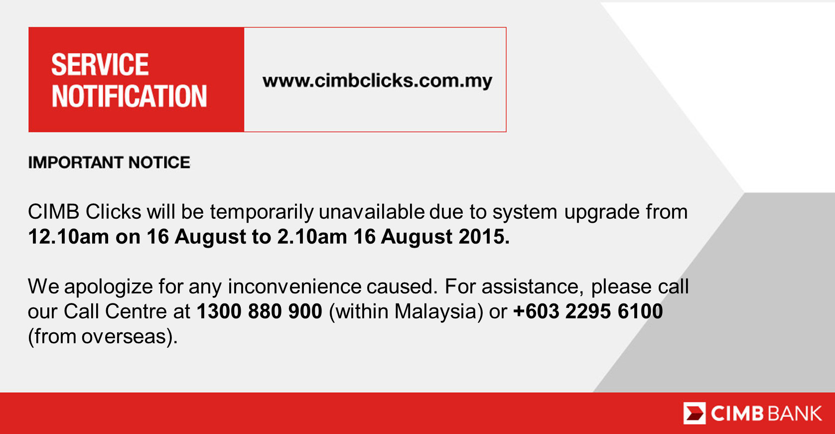 Cimbmalaysia On Twitter Important Notice Cimb Clicks Will Be Temporarily Unavailable Due To System Upgrade From 12 10am To 2 10am On 16 Aug Http T Co Anvnvyejrk