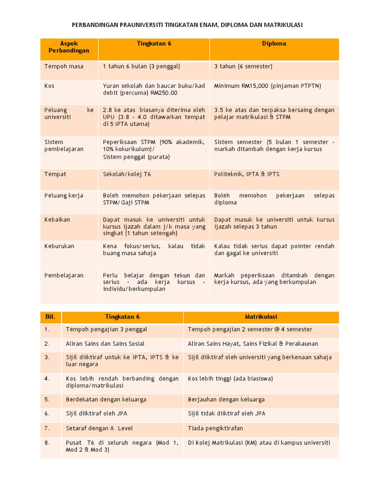 Perbandingan Prauniversiti Tingkatan Enam Diploma Dan Matrikulasi