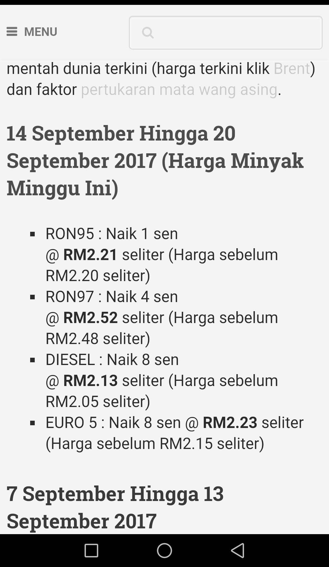 Pengumuman harga terbaru dan terkini bagi minyak ron95 ron97 dan diesel untuk mingguan mulai 14 hingga 20 september 2017.