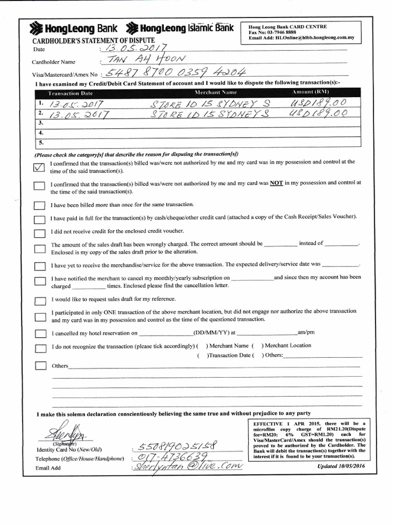 Hong Leong Bank Statement Of Dispute